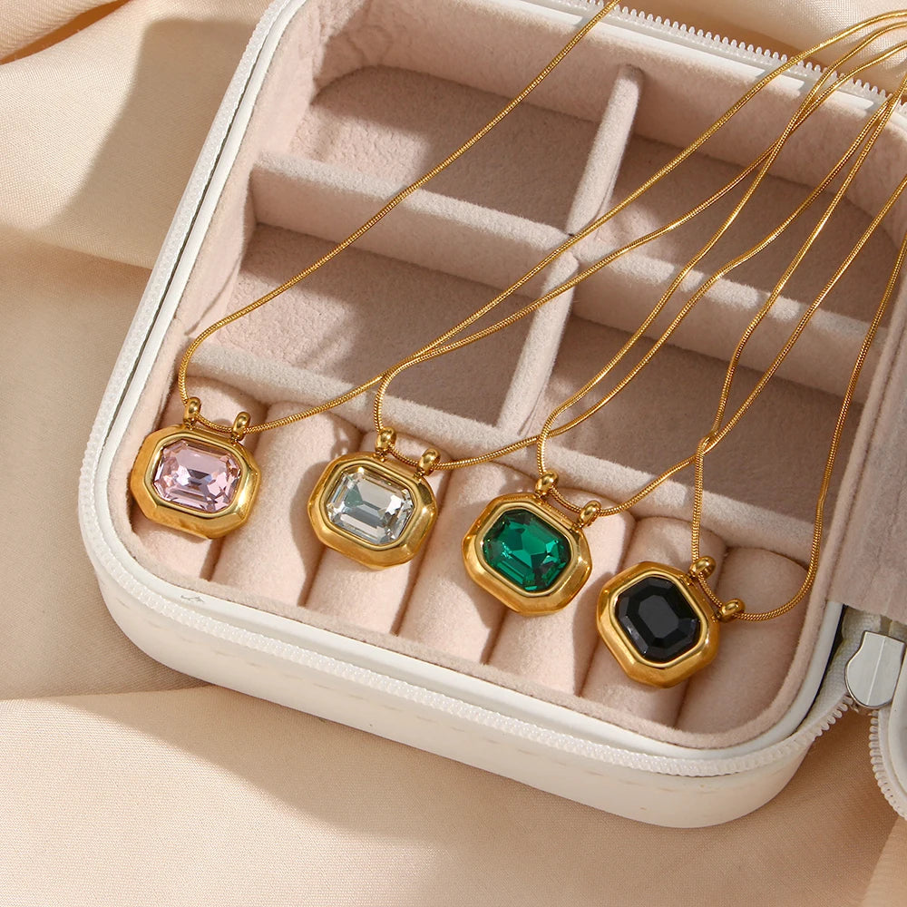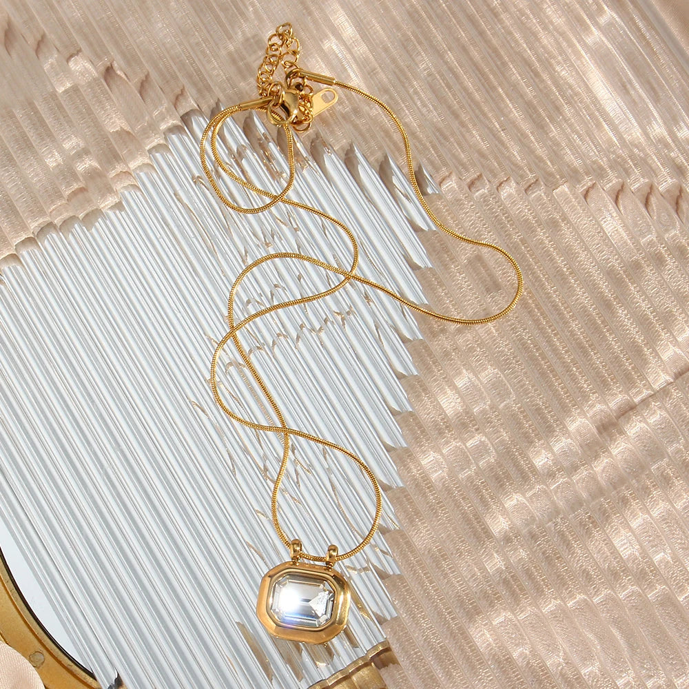 Discover the timeless beauty of our Minimalist Snake Chain Pendant Necklace. Crafted with precision, this piece features a stunning rectangle pendant adorned with a large cubic zirconia stone, offering a touch of luxury to any outfit.